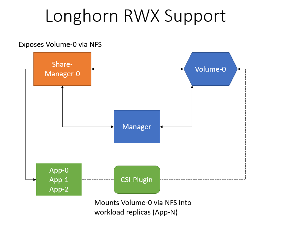 Longhorn natively supports RWX workloads, by exposing a regular Longhorn volume via a NFSv4 server (share-manager).