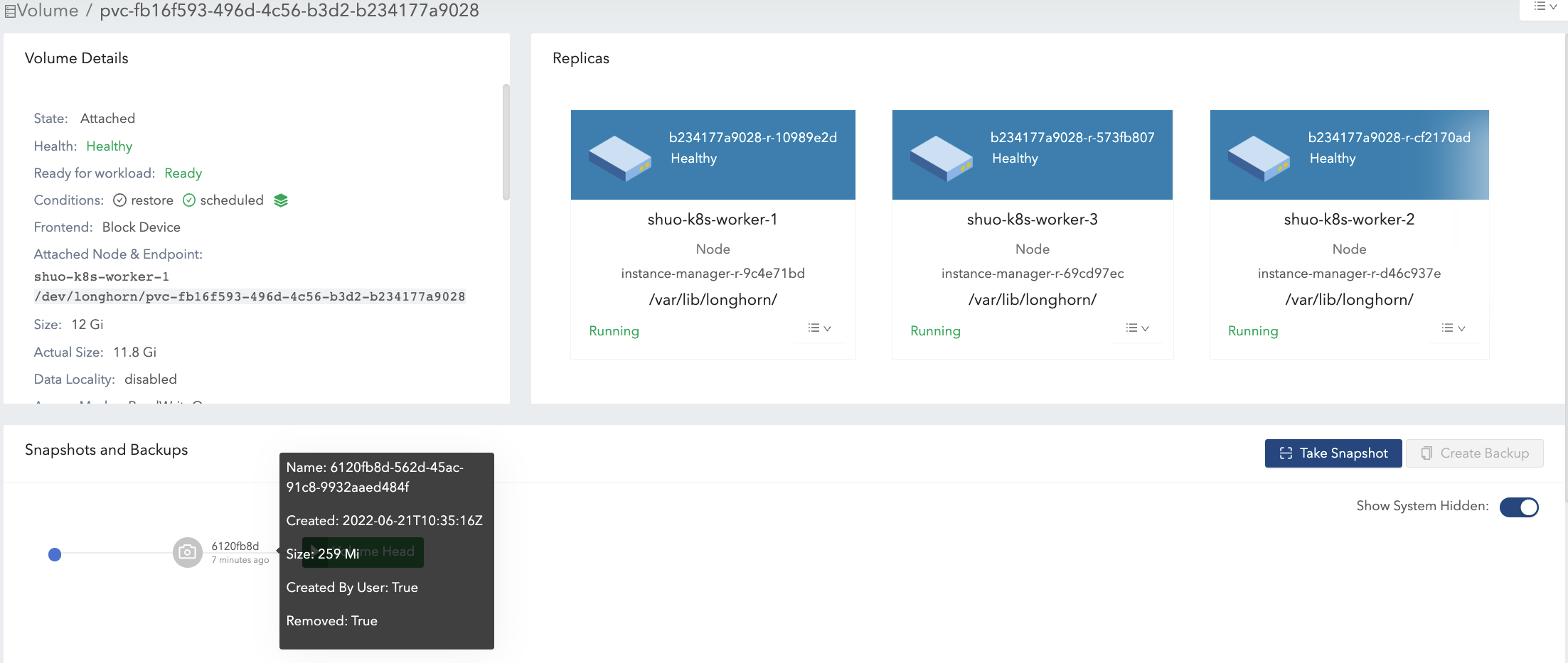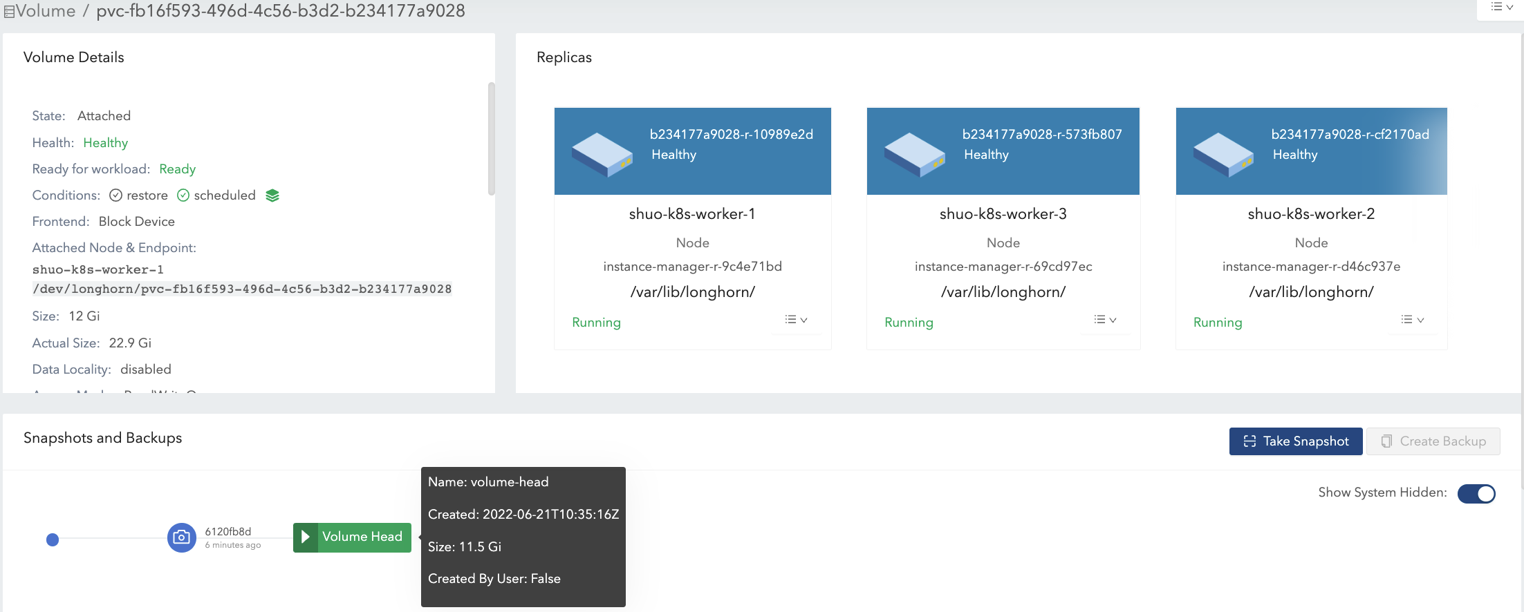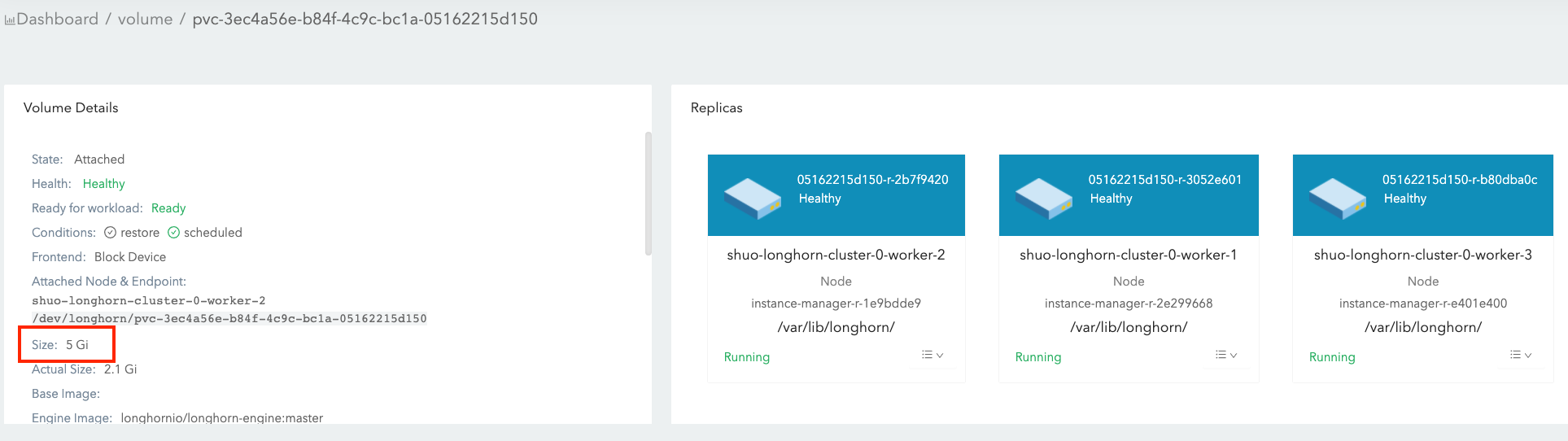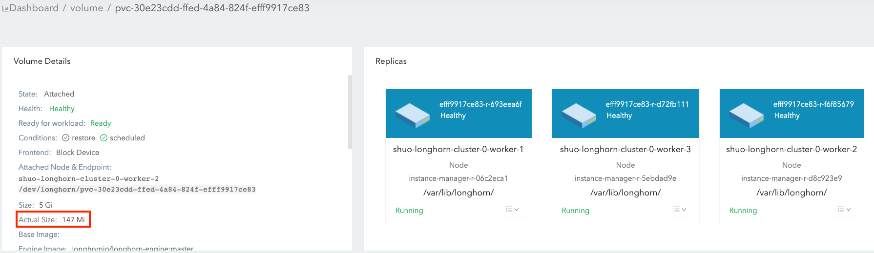 actual sizeis not shrunk after deleting the 4 Gi data. Longhorn is a block-level storage system. Therefore, the deletion in the filesystem only marks the blocks that belong to the deleted file as unused. Currently, Longhorn will not apply TRIM/UNMAP operations automatically/periodically. if you want to do filesystem trim, please check this doc for details.