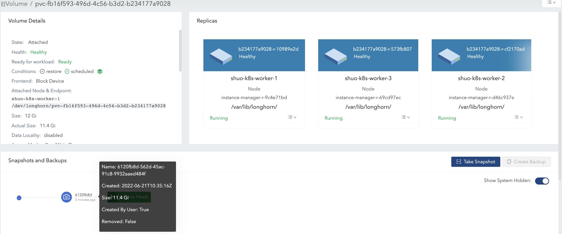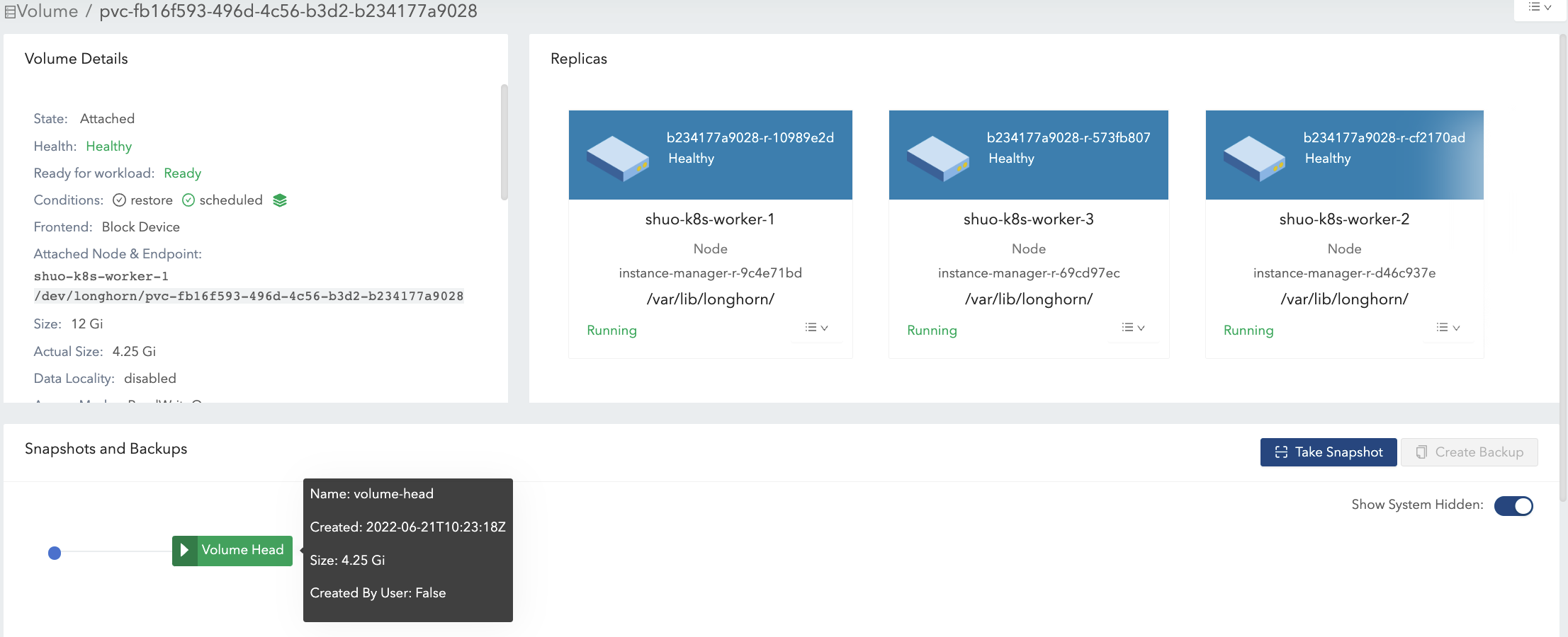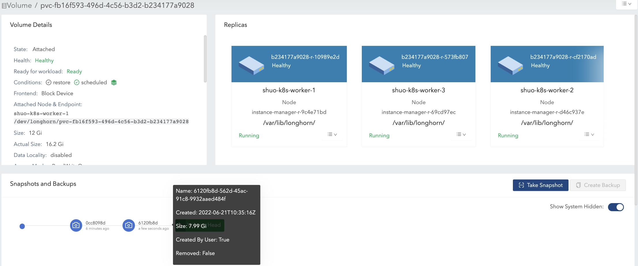 actual sizeis not shrunk after deleting the 4 Gi data. Longhorn is a block-level storage system. Therefore, the deletion in the filesystem only marks the blocks that belong to the deleted file as unused. Currently, Longhorn will not apply TRIM/UNMAP operations automatically/periodically. if you want to do filesystem trim, please check this doc for details.