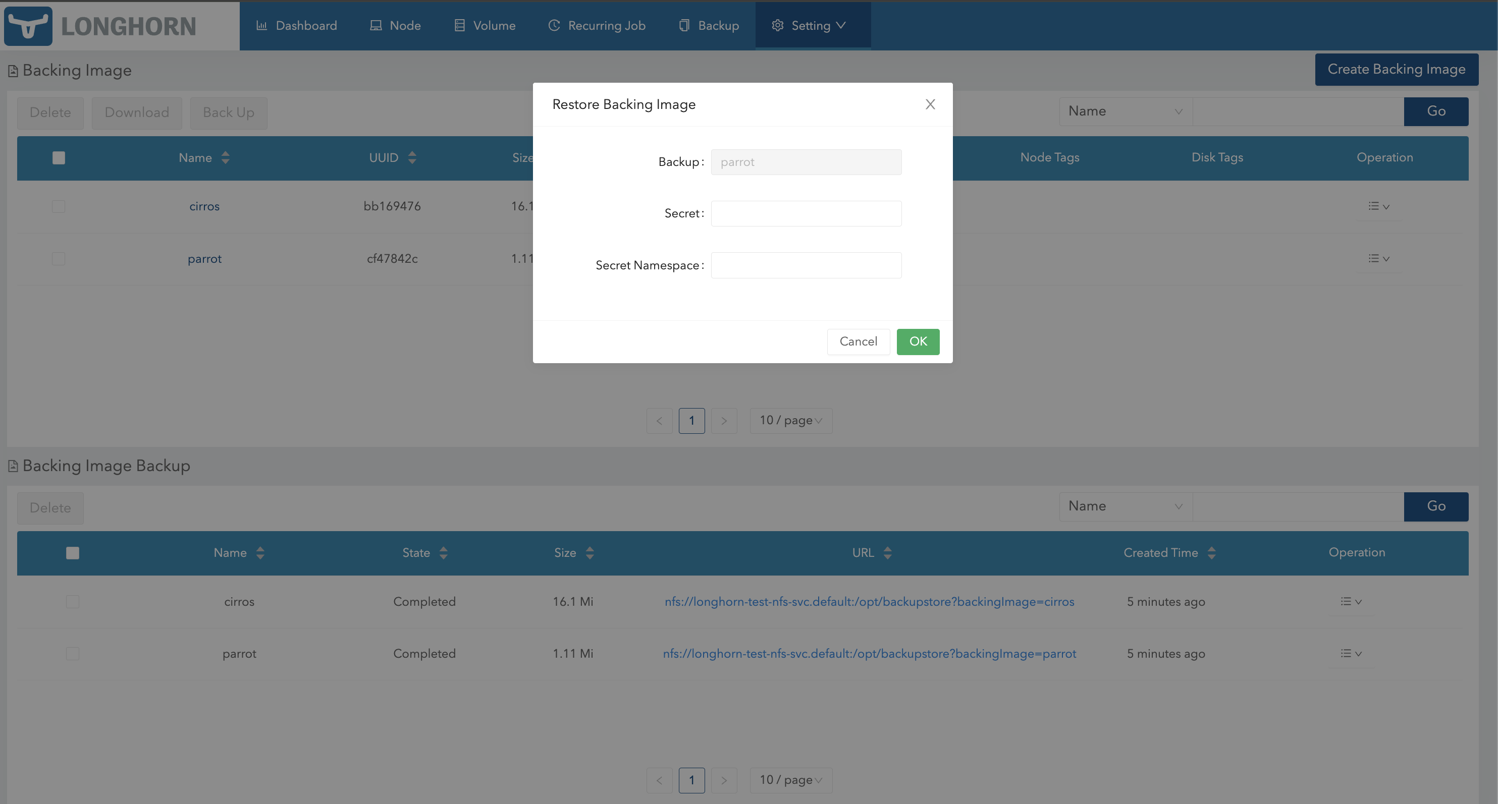 • name: Use the same name for the backing image and its backup. If the names are not identical, Longhorn will not be able to find the backing image.